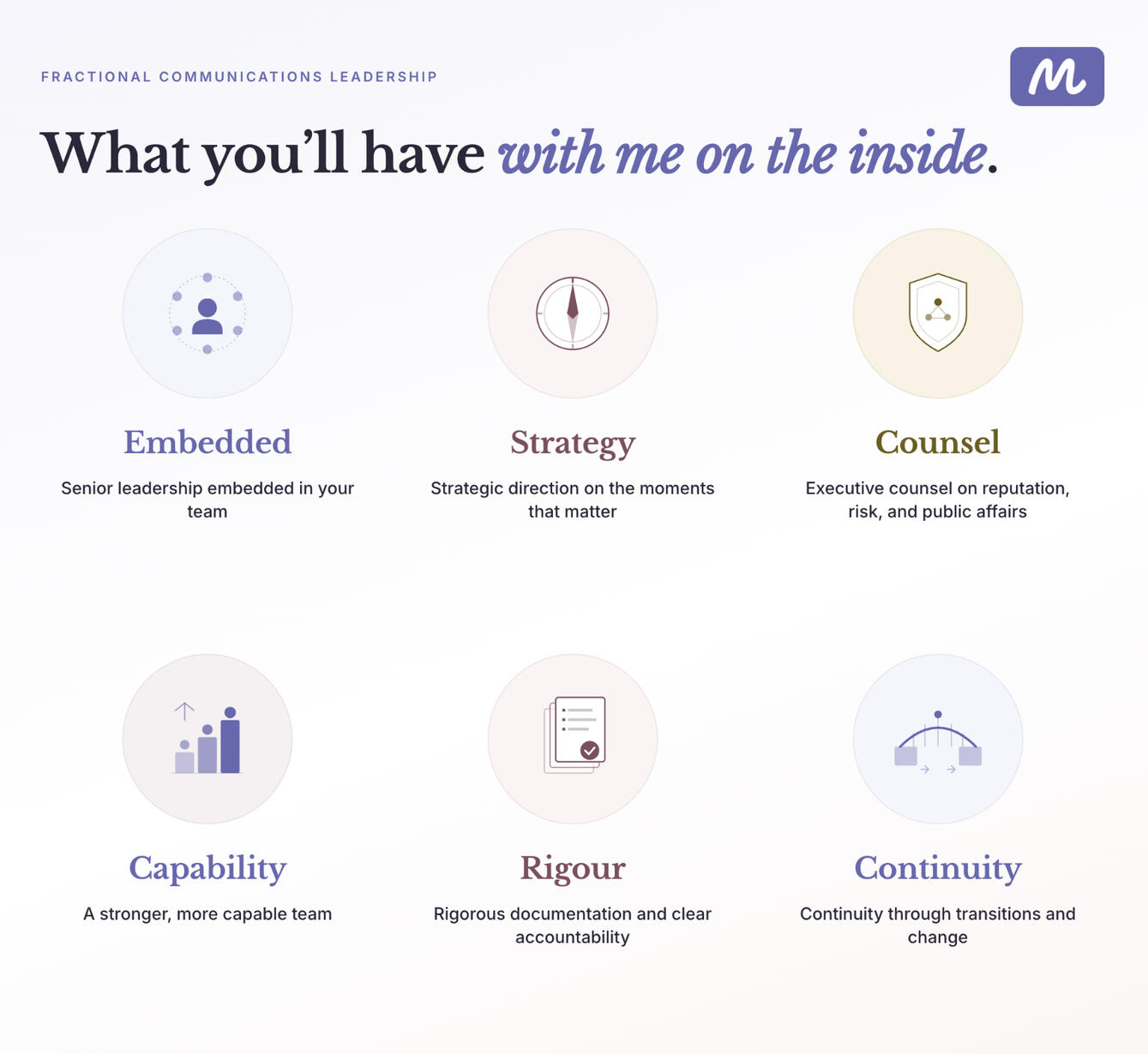 Many growing organizations hit the same gap: scaling faster than the team can absorb, a key leader stepping out, or a need for senior judgment in the room without taking on a full-time hire.My fractional engagement gives you 15 years of strategic communications experience without the overhead of a permanent hire. I've led files spanning public affairs and regulatory issues, reputation and crisis management, CEO transitions, funding and growth milestones, media relations and the infrastructure work of building communications functions from scratch.The goal is to bridge the gap. Get senior leadership in the seat when you need it most; holding the function together and moving the work forward until the right long-term structure is in place.