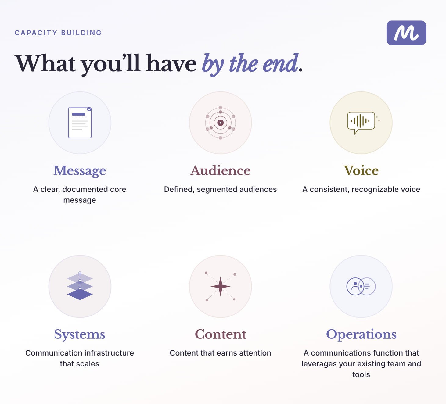Most founders and teams I have worked with have a communication consistency problem. Every announcement, stakeholder update, and high-stakes moment gets built from scratch on instinct and precedent. It works until it doesn't, usually right when the stakes get higher.My capacity building service is a storytelling system upgrade for organizations where communication has never been a formal function. Working alongside you and your team, we build the six core elements that turn ad-hoc effort into reliable capability.The goal is to build the muscle. Not dependency on an outside consultant, but the internal capability your organization needs to communicate confidently long after our engagement ends.